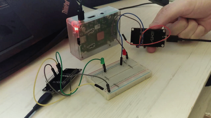 In this first experiment we are going to focus on the core functionality of the MQTT protocol: publish/listen to messages to/from a topic, and use this to toggle an LED. As a trigger to send the messages I have used 2-way switches, not very suitable for prototypes as you can see in the GIF below, but much cooler the typical flat buttons of four pins that are usually used in most of the tutorials.