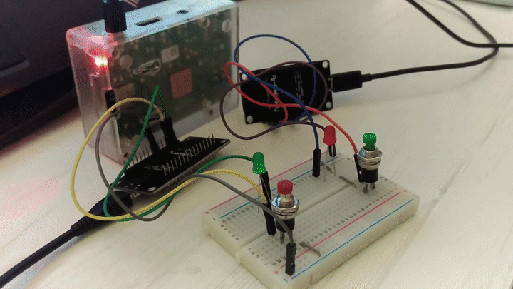 The workflow is simple: when we press the button of the device on the left, it will toggle the LED from the right; and vice versa. The only trap is that each device listens to all the messages that are published, so we need to filter out the self-published messages to avoid acting on itself.
